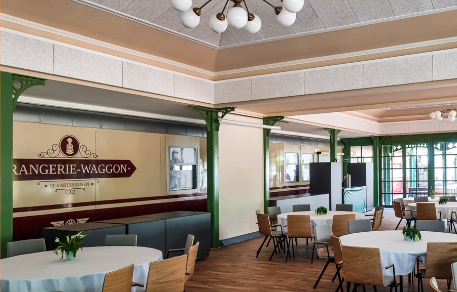 Eine restaurierte Dampflok BJ 1952 mit Waggons, eine jugendstilähnliche Orangerie mit Kronleuchtern und die denkmalgeschützte Rangierhalle rahmen den schattigen Biergarten ein. Jedes Element des Gastronomie-Konzeptes ist ein Highlight für sich und lässt den Betrachter staunen. Die restaurierte Dampflok mit ihren Waggons bildet das Herzstück im neuen Restaurant „Bahnhofmann“. Eine Infrastruktur für bis zu 500 Gäste wurde in die Waggons eingebaut und beherbergt eine hochmoderne Küche, eine Getränkeausgabe, eine Spülküche und ein Kühlhaus. Eine geeignete und leistungsfähige Ausstattung ist dafür Voraussetzung. Die Spültechnik ist von der Firma Meiko und die Geräte der Gartechnik von der Firma Rational. Platz finden die Gäste nicht nur im Biergarten, sondern auch im Bahnhofsrestaurant, welches im originalen Bahnhofs-Charme restauriert wurde. Das Ambiente wird durch das Geschirr „Purity“ (Firma BHS) und die Besteck-Kollektion „Metropole“ (Firma Amefa) veredelt. Die denkmalgeschützten Räume der Rangierhalle und der Orangerie kann man als Event-Location mieten, aber die Vision von Geschäftsführer Stefan Dombosch ist noch größer: Zukünftig sollen Geschäftskunden mit der eigenen Bahnhofmann-Bahn in Nürnberg oder Stuttgart abgeholt und im Zug, in der eigens eingerichteten Gastronomie, bewirtet werden. Sobald die Bahn in Eckartshausen angekommen ist, können dort die Gäste wie gewünscht feiern und abends werden sie von der Bahnhofmann-Bahn auf demselben Weg wieder nach Hause gebracht. Schon jetzt gibt es viele Anfragen zu der Event-Location und die ersten Hochzeiten sind bereits in Planung.